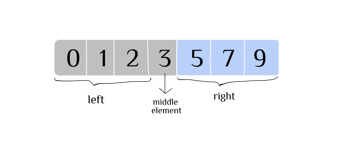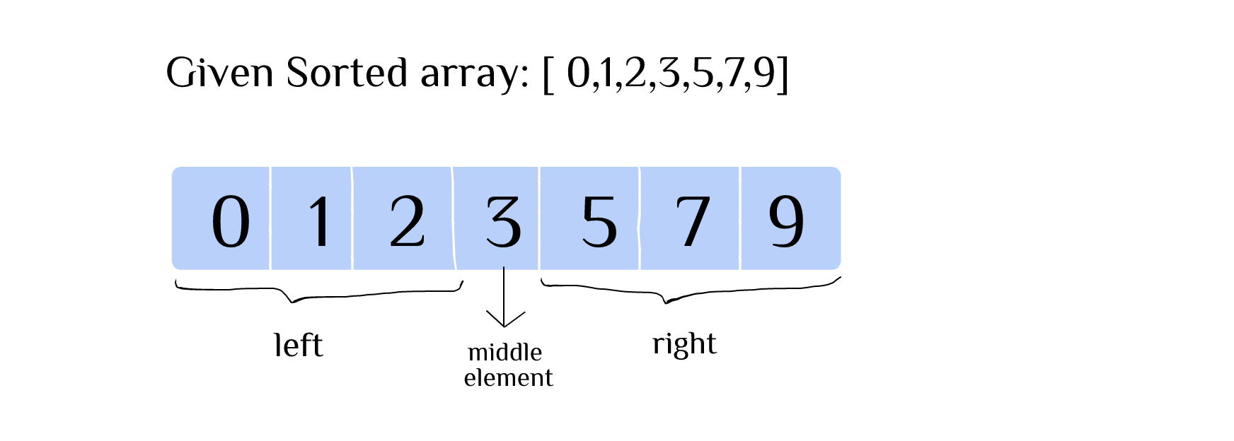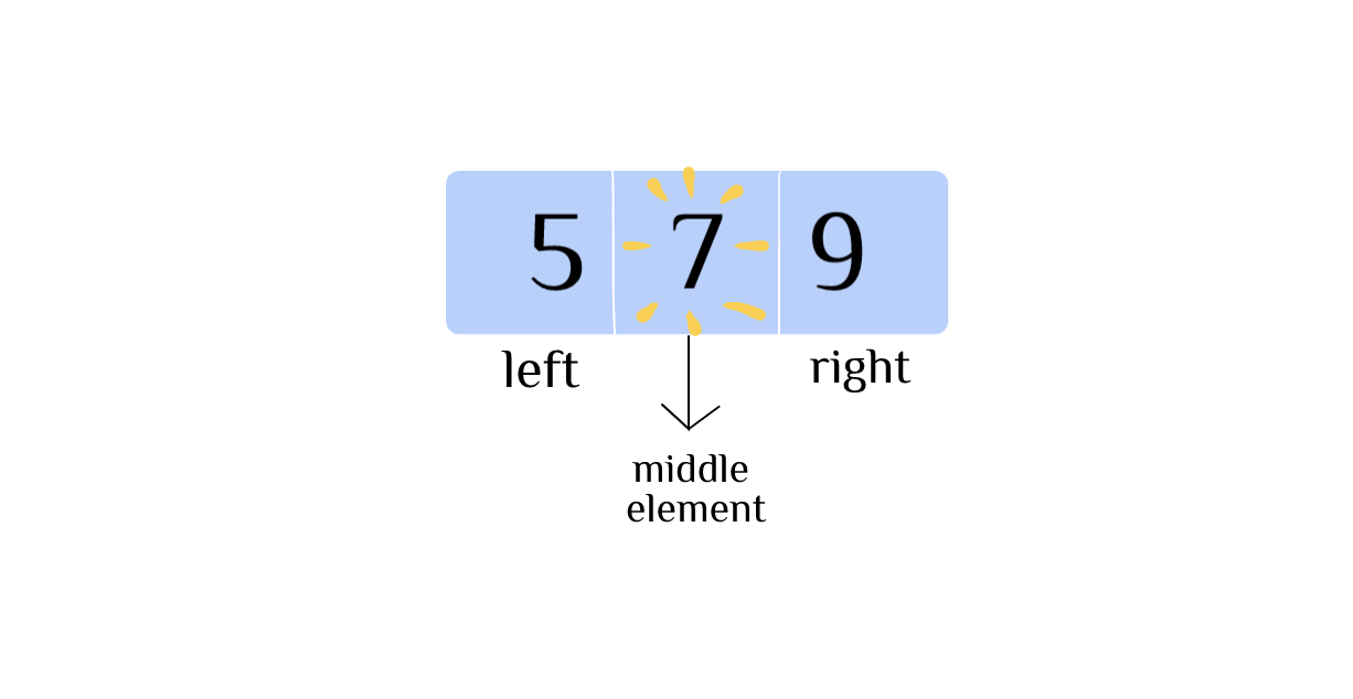 Given a sorted array [ 0, 1, 2, 3, 5, 7, 9] and our target element is 7, we first find the middle element by diving the array into two. Identifying 3 as the middle element, we have the left interval [0, 1, 2] and the right interval [5, 7, 9]. The sorted array (in ascending order) ensures elements in left interval are all smaller than the middle element while the elements in the right interval are all bigger than the middle element.