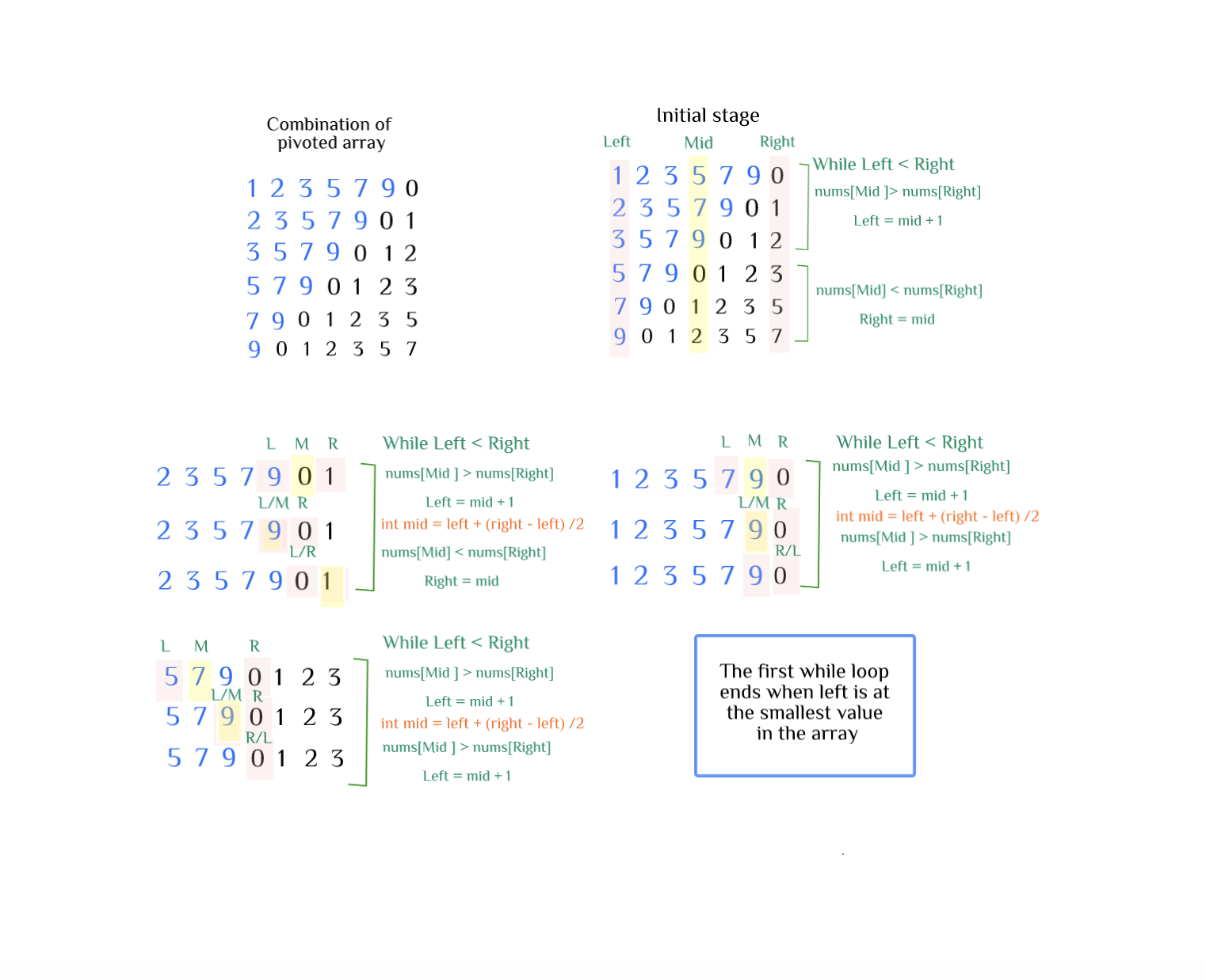 First, we can locate the smallest element in the array. Since the smallest element is the pivot point, we know that both left and right side of the smallest element will be arraged in ascending order. With this in mind, the first while loop is set to find the smallest element. Observed that the smallest element is always named as the left bounded variable.
