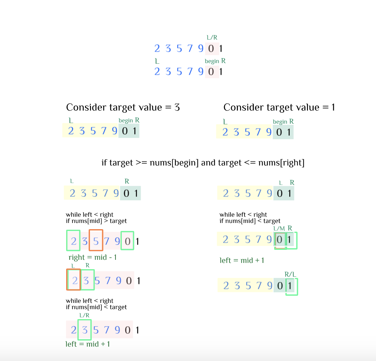 Once the smallest element in the array is found, a variable int begin = left is created to indicate the starting index of smallest element. Next, left and right boundary are reset again with the new variable begin in the array. Two sorted arrays can be seen from left to begin and from begin to right. Now, original binary search can be conducted after we compare target value to the value in the begin index. If target value is bigeer than the nums[begin] and smaller than nums[right], we shift left boundary to begin and binary search on the right side. Else, we shift the right boundary to begin and search on the left side. As such, the target value will be returned in O(log n) time.